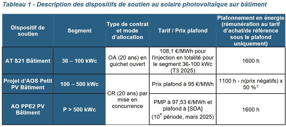 Pour rappel, comme acté par l’article 1er de l’arrêté du 26 mars 2025 modifiant l’arrêté du 6 octobre 2021, cette procédure d’appel d’offres se substitue au soutien prévu au sein de l’arrêté tarifaire dit « AT S21 Bâtiment » pour les installations du segment de puissance visé. La CRE est favorable au projet de cahier des charges de l’AOS, qui doit permettre un développement optimisé du segment de puissance 100-500 kWc du photovoltaïque sur bâtiment.