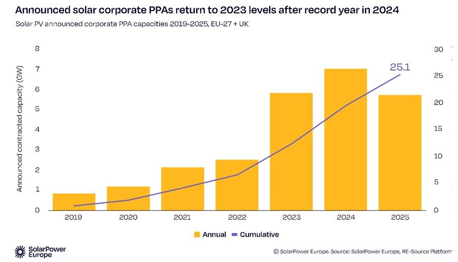Le marché des contrats d’achat d’électricité (PPA) pour entreprises (*) présente un tableau légèrement différent. Immédiatement après la crise énergétique de 2023 et 2024, les PPA solaires ont connu plusieurs années de forte croissance. En 2025, cependant, les volumes de PPA pour entreprises dans le secteur du photovoltaïque sont tombés en dessous du record de l’année précédente pour la première fois depuis plusieurs années.