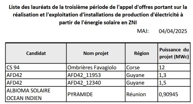 Dans le cadre de la 3e période de l’appel d’offres « 2023 PV ZNI », la Direction générale de l’énergie et du climat vient de désigner 4 lauréats pour une puissance de 15,7 MWc, une liste conforme aux propositions de la Commission de régulation de l’énergie. À la suite de cette désignation, la CRE publie … Lire la suite de Appel d’offres PPE2 ZNI : 4 lauréats ont été désignés pour une puissance de 15,7 MWc