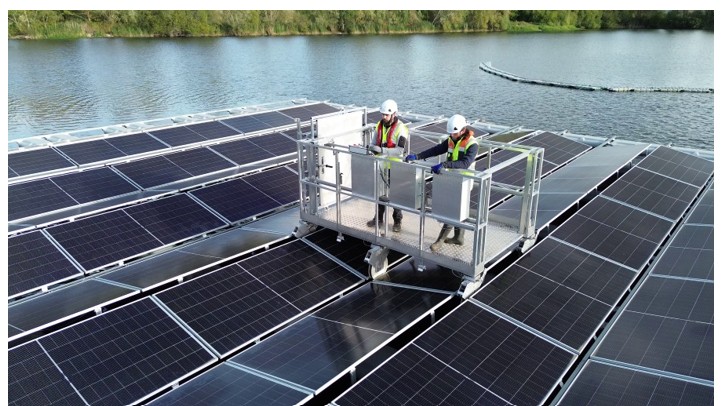 Pour opérer cette nouvelle technologie sans allées de maintenance, Ciel & Terre a développé un chariot électrique motorisé dédié à l’exploitation des centrales conçues avec WattRack. Cette plateforme roulante permet aux opérateurs de circuler librement sur l’ensemble de la plateforme flottante et d’intervenir en toute sécurité sur les différents modules PV, éléments électriques ou points d’ancrage.