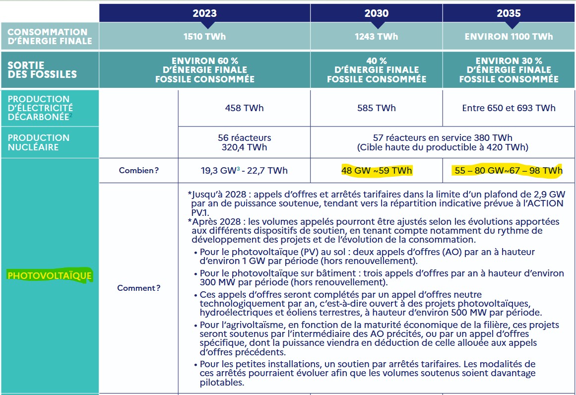 Le document stipule que le rythme de capacités à attribuer ou à contractualiser pour le développement du photovoltaïque ne pourra pas excéder 2,9 GW par an d’ici à 2028. Il sera ensuite a priori de 5GW/an mais pourra être ajusté, à la hausse ou à la baisse, en tenant compte notamment des prévisions d’évolution de la consommation d’électricité et de développement des flexibilités, afin d’assurer une contribution optimale à l’équilibre offre-demande.
