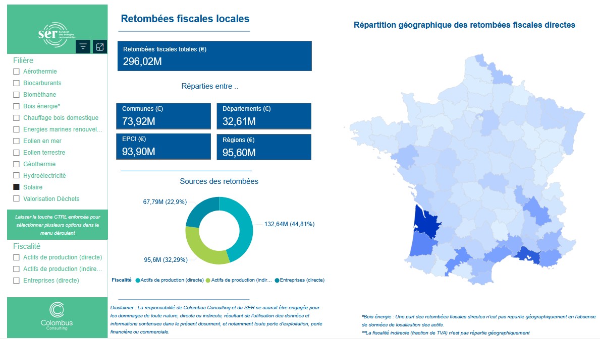 Le SER met en ligne un Atlas fiscal interactif des EnR, accessible depuis le site www.enr.fr, permettant de visualiser filière par filière et pour chaque niveau de collectivité locale, les retombées fiscales générées par les EnR. Pour le solaire, cela représente 296 M€, à comparer à 642 M€ pour l’hydroélectricité et 239 M€ pour l’éolien terrestre.