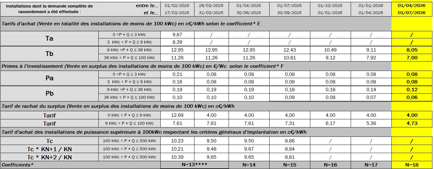 La Commission de régulation de l’énergie a publié le 23 mars les nouveaux tarifs d’Obligation d’Achat (OA) applicables du 1er avril au 1er juillet 2026 pour les installations sur bâtiment, hangar ou ombrière < 100 kWc en Métropole. Ils reculent de 11,6% pour les installations de 9 à 100 kWc. Comme prévu, les tarifs continuent ainsi de baisser pour inciter à l’autoconsommation et au stockage.
