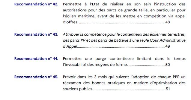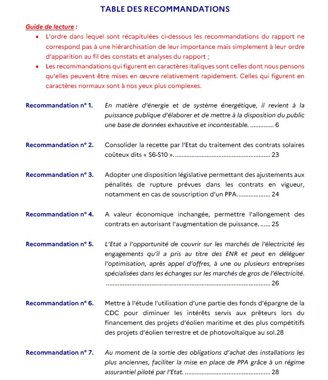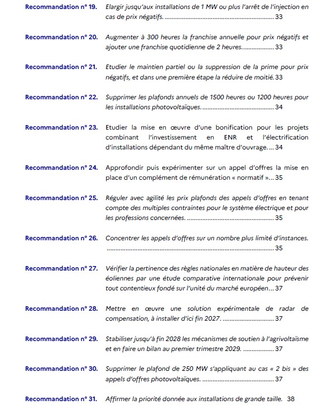 Les recommandations de la mission visent ainsi à réduire le coût du soutien public tout en garantissant une électricité abondante et compétitive. Certaines des recommandations de la mission ont déjà été engagées, notamment concernant la refonte des arrêtés tarifaires et les mesures liées aux prix négatifs. Le Gouvernement annonce qu’il mettra progressivement en œuvre les recommandations sur la structure des appels d’offres, afin d’en améliorer dès que possible la compétitivité. Les volets liés au financement devront être approfondis.