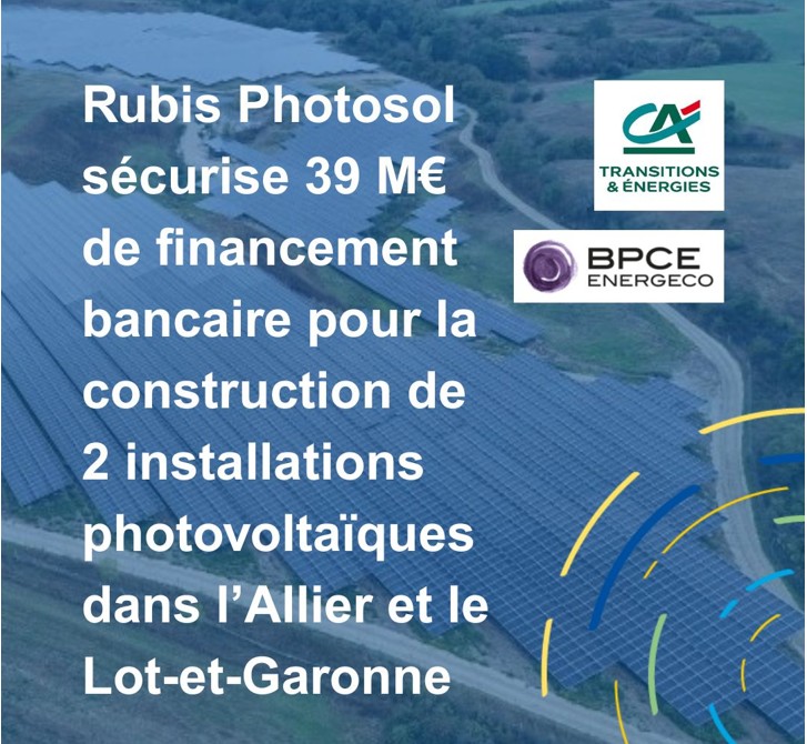 Le groupe Rubis Photosol annonce la signature d’un financement bancaire de 39 millions d’euros porté par Crédit Agricole Transitions & Energies, aux côtés de Crédit Agricole Centre France, Crédit Agricole Leasing & Factoring et BPCE Energeco pour la construction de deux projets de grandes installations photovoltaïques au sol, d’une puissance cumulée de près de 46 MW, sur les communes de Chevagnes dans l’Allier (03) et de Saint-Aubin dans le Lot-et-Garonne (47).