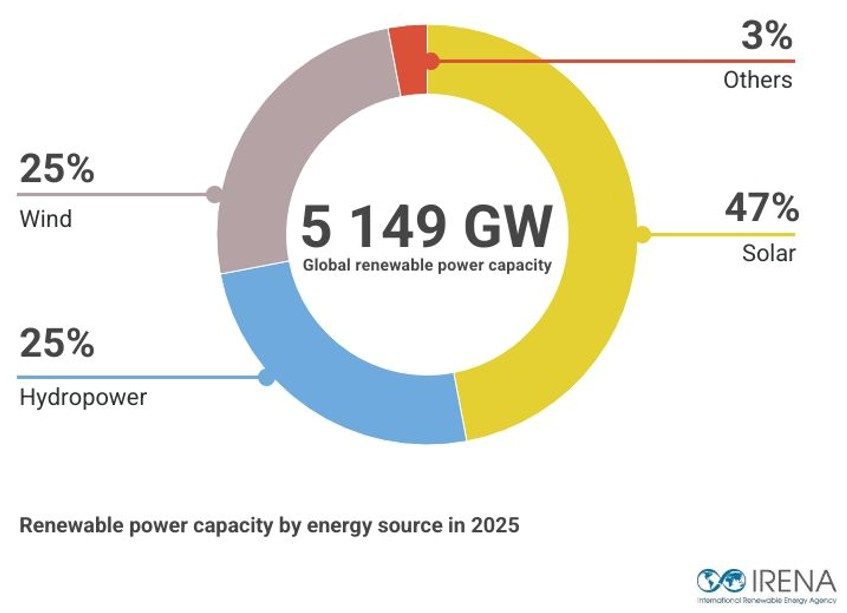 En 2025, la capacité totale installée de production d’énergie renouvelable a atteint 5149 gigawatts après l’ajout de 692 GW, soit une hausse annuelle de 15,5%, selon un nouveau rapport de l’International Renewable Energy Agency (IRENA). L’année 2025 marque ainsi un nouveau record en matière de capacité installée mondiale, incitant les pays à renforcer leur sécurité énergétique grâce à des sources renouvelables domestiques.